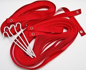 - 2 ленты длинной 16 м шириной 2,5 см из прочного и стойкого к ультрафиолетовому излучению полиэстера красного цвета с люверсами;