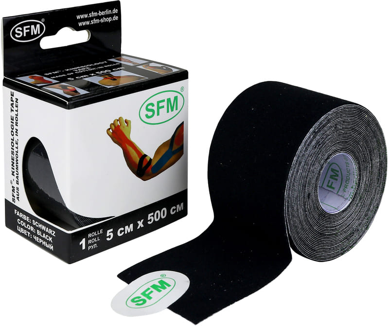 Лейкопластырь кинезио тейп используется для профилактики и лечения травм опорно-двигательного аппарата. Лейкопластырь кинезио тейп SFM 5 см Х 500 см, представляет собой эластичную хлопковую ленту на клейкой гипоаллергенной основе.