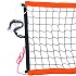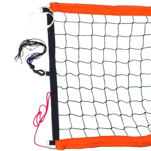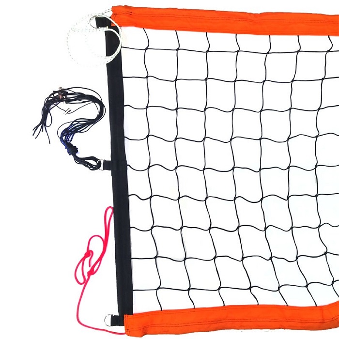 Верхние и нижние ограничительные ленты шириной 7,5 см ярко-оранжевого цвета, боковые ленты шириной 5 см из полиэстра черного цвета. Полотно сетки из специального светостабилизированного, водоотталкивающего пропилена черного цвета (толщина нити 3 мм, ячейка 10см*10см). Применение данных материалов позволяет использовать сетку на открытых площадках при игре в агрессивных погодных условиях (яркий свет, дождь, высокая влажность, низкая температура воздуха) без угрозы растяжения и провисания полотна сетки, и разрушения структуры материала. Для равномерного натяжения сетки предусмотрены по 3 полипропиленовых шнура с каждой стороны, а также в боковые ленты вставлены фибергласовые стрежни, за счет чего сетка выглядит ровно натянутой даже при недостаточном натяжении троса и боковых шнуров.