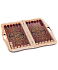 Нарды средние "Дипломат" (в чехле) - модель необычной формы - "дипломата" с вырезанными ручками. Ее удобно нести в руке. Чтобы нарды не поцарапались во время хранения, предусмотрен тканевый чехол. На внешнюю поверхность доски нанесен тематический рисунок. Такие нарды могут стать изысканным подарком истинному поклоннику.