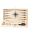 Шашки с доской изготовлены из натуральных материалов: древесины хвойных и лиственных пород, игровое поле с нанесенной шелкографией дополнительно покрыто лаком. В комплект также входят 30 деревянных фишек и 2 кубика зара.