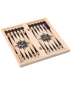 В комплекте: доска, деревянные фигуры для шахмат, 30 деревянных фишек для шашек/нард, 2 зары