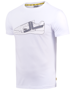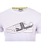 Стильная футболка для занятий спортом и тренировок, имеет оригинальный принт на передней части изделия, выполненного в виде кроссовка. Модель с прямым кроем, короткими рукавами и округлой горловиной, внутри горловина подшита с логотипом бренда.