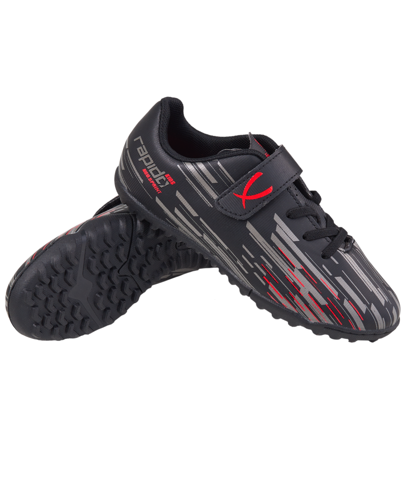 В Rapido Kids используется технология Speedtech для максимальной скорости на поле. Анатомическая форма новой колодки обеспечивает еще более правильное положение стопы. Носочная часть усилена дополнительной прошивкой. Мягкая стелька из материала ЭВА распределяет нагрузку и дает необходимый комфорт. Улучшенный механизм липучки и не требующие завязывания резиновые шнурки - теперь надевание будет еще быстрее и удобнее. Для дополнительного вентилирования в язычке сделаны специальные отверстия. Подошва обуви оснащена резиновыми шипами, которые обеспечивают оптимальное сцепление с искусственными покрытиями.