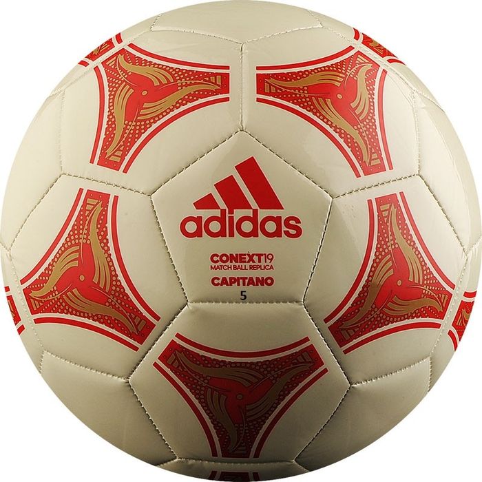 Любительский мяч "ADIDAS Conext 19 Capitano". Покрышка из глянцевой синтетической кожи (термополиуретан) с одним подкладочным слоем синтетической ткани. Машинная сшивка, бутиловая камера, армированная синтетической нитью, бутиловый ниппель. Размер 5, 32 панели.