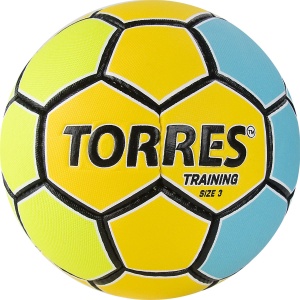TORRES Training - тренировочный мяч для команд и клубов среднего и любительского уровней, также подходит для  проведения соревнований местного значения. Покрышка из синтетической кожи (полиуретан) толщиной 1,2 мм на нетканой основе и 4 подкладочных слоя (1 слой хлопка, 2 слоя вискозы, 1 слой вспененной резины). Слой вспененной резины придает мячу исключительную мягкость, что вкупе с нескользящей кожей обеспечивает плотный контакт рук и мяча, позволяя надежно фиксировать мяч. Структура используемой синтетической кожи допускает использование мастики. Латексная камера с двойным бутиловым ниппелем. Ручная сшивка, 32 панели.
