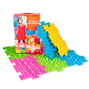 Детский массажный коврик FOSTA состоит из 8-ми элементов-модулей прямоугольной формы, соединяющихся между собой по принципу пазла. Массажные бугорки, расположенные на поверхности модулей и имеющие различную высоту и диаметр, стимулируют рецепторы подошвенной поверхности стопы ребенка, способствуя формированию ее физиологических сводов.