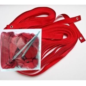 В комплекте 4 ленты из прочного полиэстера (2 шт. длиной 8 м и 2 шт. длиной 16 м)  шириной 5 см каждая с металлическими люверсами и 6 металлических колышка для соединения лент (через люверсы) и их фиксации и регулировки натяжения.