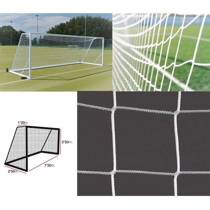 Сетка футбольная тренировочная El Leon De Oro 12444012000. Рекомендуется для игр и тренировок команд и клубов среднего уровня, для общеобразовательных учреждений. Произведена по безузловой технологии, ячейка - четырехугольная стандартного размера 10х10 см. Нить 4,0 мм, светостабилизированный (защита от ультрафиолета) и стойкий к агрессивным атмосферным воздействиям полипропилен. Под размер ворот: а: 7.50 м (длина), b: 2.50 м (высота), c: 1.20 м (глубина ворот по верху), d: 2.50 м (глубина ворот по низу). Цвет белый.