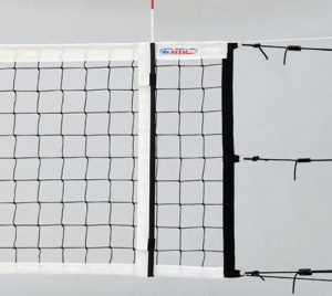 Сетка волейбольная для проведения официальных игр Kv. Rezac EXTRA артикул 15025530. Сертификат DVV позволяет рекомендовать её для проведения соревнований различного уровня. Произведена по безузловой технологии, ячейка - четырехугольник 100х100 мм. Нить 3,0 мм полипропилен, стойкий к агрессивным атмосферным воздействиям и с защитой от ультрафиолета. Стандартные размеры: длина 9,5 м, ширина 1 м. Верх сетки окантован белой лентой шириной 70 мм из прочного, износостойкого полиэстера, таким же образом обработан и низ сетки шириной 50 мм. Сетка поставляется с кевларовым тросом длиной 12,5 метров. У сетки 6 шнуров для натяжения, по три с каждой стороны, на каждом шнуре пластиковый блок-натяжитель, есть боковые вставки из фибергласовых стержней для идеально ровного натяжения сетки. В комплекте идут ограничительные ленты.