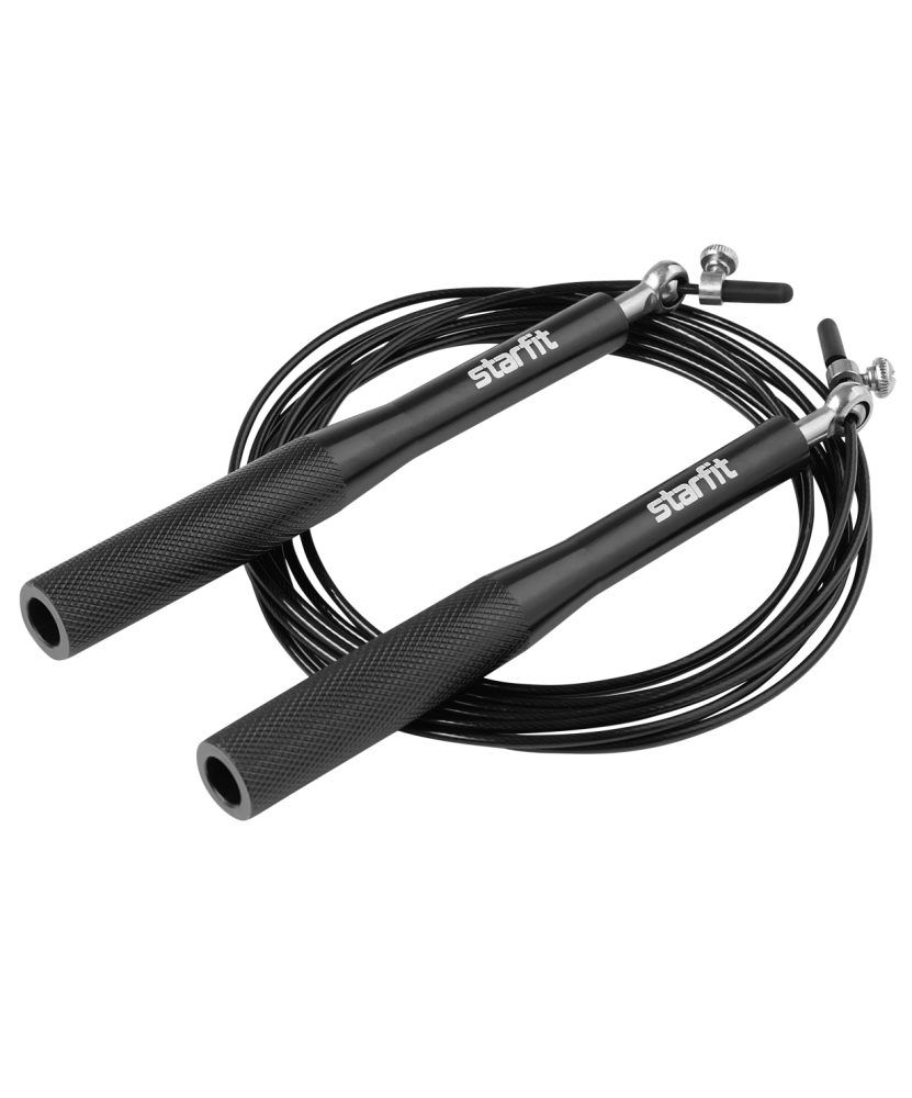 Скакалка скоростная RP-301 бренда STARFIT – многофункциональный спортивный инвентарь для фитнеса дома или на улице. Эти прыгалки взрослые с металлическими ручками позволяют совершать двойные и тройные прыжки, такая скакалка для фитнеса взрослая отлично подойдет для кардиотренировок и функционального тренинга. Также модель прекрасно зарекомендовала себя как скакалка для кроссфита, и как скакалка для бокса. Скоростная скакалка имеет металлические 3D-шарниры, которые улучшают показатели изделия благодаря отсутствию ограничения вращения троса вокруг оси и продлевают срок эксплуатации. Скакалки дополнены ручками из металла с глубокой насечкой, это гарантирует надежный хват. Встроенные подшипники позволяют увеличить темп прыжков и повышают плавность хода троса, а для безопасности тренировок стальной трос покрыт защитным слоем. Длина регулируется с помощью специального ограничителя.