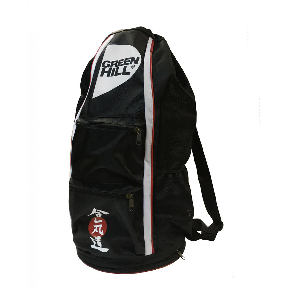 Сумка-тубус "GREEN HILL". Изготовлена из полиэстера 1680D и 600D. Закрывается на шнуровке, носится на одной лямке. Состоит из большого отделения, двух внешних карманов и отделения в основании сумки. Боковые стороны выполнены из сетки для вентиляции. Размер сумки позволяет уместить полный комплект экипировки для ударного вида единоборств.