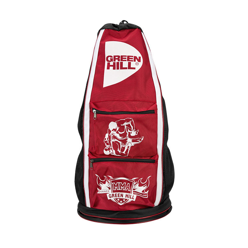Сумка-тубус "GREEN HILL". Изготовлена из полиэстера 1680D и 600D. Закрывается на шнуровке, носится на одной лямке. Состоит из большого отделения, двух внешних карманов и отделения в основании сумки. Боковые стороны выполнены из сетки для вентиляции. Размер сумки позволяет уместить полный комплект экипировки для ударного вида единоборств.