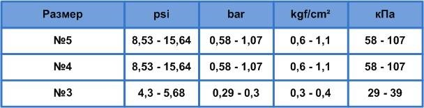 ВАЖНО! Данные таблицы несут справочный характер и могут не соответствовать требованиям некоторых производителей. Как правило, производитель всегда указывает рабочее давление мяча у ниппеля. Обязательно проверяйте данную информацию.