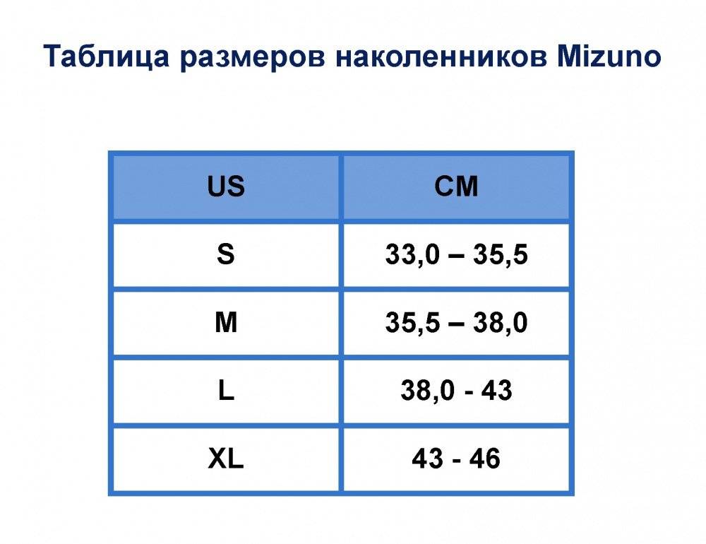 Таблица размеров наколенников Mizuno