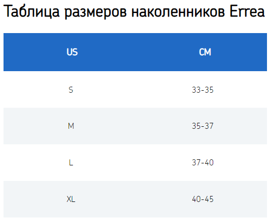 Таблица размеров наколенников Errea